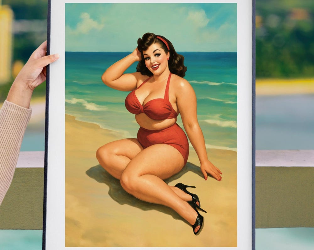 Vintage Plus Size Pin-Up Poster | Curvy Beach Girl Art Print | Glamorous Retro Pinup Decor