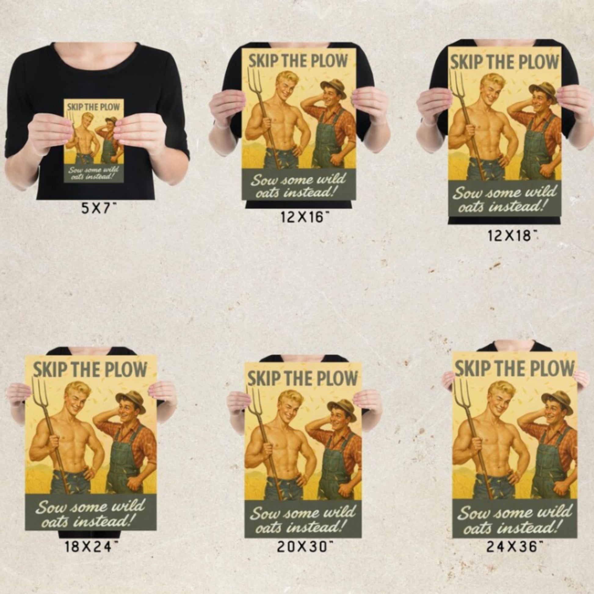 Add a little vintage humor and retro charm to your walls with this playful “Skip the Plow - Sow Some Wild Oats Instead!” pin-up poster. Inspired by mid-century advertising and wartime-era illustration styles, this piece blends classic Americana with a wink of cheeky humor.